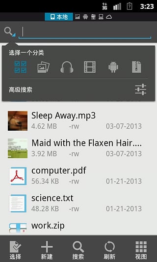 点击下方工具栏中的搜索,就会在屏幕上方出现搜索框,可以输入关键字或者文件后缀名进行搜索,如图。