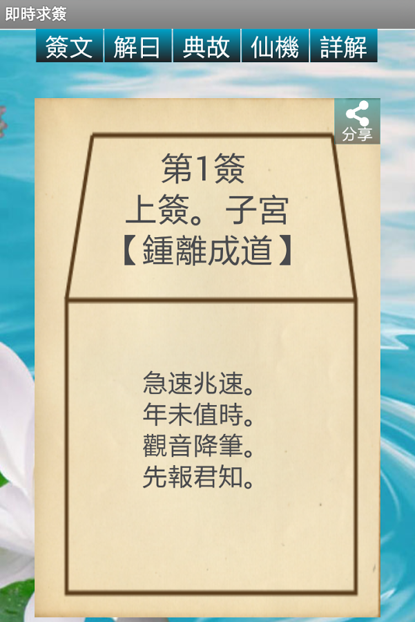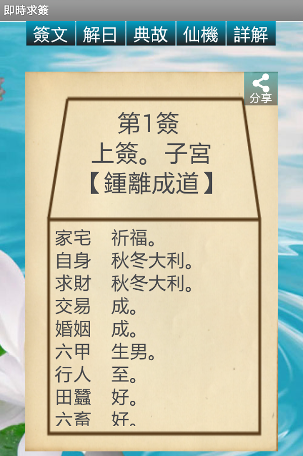 本免费软件支援繁体简体,并提供求签、查解签文、详解、仙机及记载。另外,本软件支援分享功能,可以将签文跟家人朋友分享。