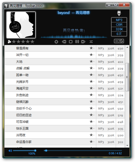 Foobar2000 是一个 Windows平台下的高级音频播放器.包含了一些播放增益支持、低内存占用等基本特色以及内置支持一些流行的音频格式. 特色: * 内置音频格式支持: WAV,AIFF, VOC, AU, SND, Ogg Vorbis, MPC, MP2, MP3 * 通过官方插件支持的音频格式:MPEG-4AAC, FLAC, Ogg FLAC, Monkey Audio, WavPack, Speex, CDDA, SPC, 各种 MOD类型; 从 RAR、ZIP 压缩包里直接读取音频 * 完全支持 Unicode * 先进的文件信息处理能力 *可以使用转换器组件对所有支持的格式转换编码格式 * 支持播放增益 * 可自定义快捷键 * 开放的组件体系结构允许第三方开发者来扩展播放器的功能.