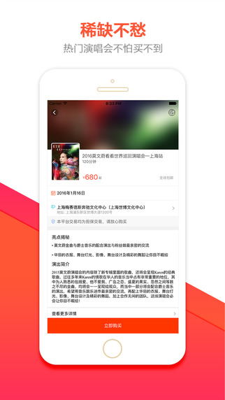 特点一:折扣票——每天都有不同折扣票大放送特点二:热销票——保证票源,确保票品真实