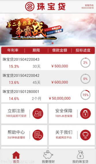 珠宝贷(zhubaodai.com),P2P投资理财专业平台。东方金钰、金一文化、萃华珠宝三大上市公司携13家知名珠宝企业倾力打造,实收资本达4.3亿元,风险准备金超过4800万。四大融资性担保公司,多级风控审核,多种产品选择。【软件特点】