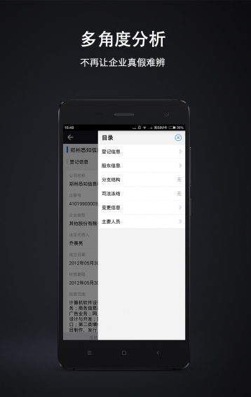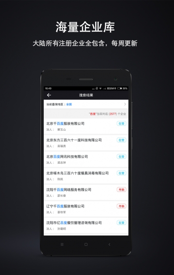 *企业工商档案查询:查询大陆所有注册企业的工商档案,包含法人、联系方式、注册资本等等*周边企业:获取当前位置周边所有企业及其工商档案
