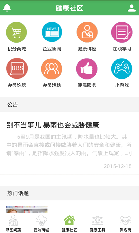 健康社区:实现积分兑换,企业新闻,医疗相关知识学习等;
