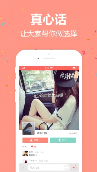 最走心的倾诉交友平台。无论你有任何的心事烦恼,又或是空虚寂寞,都有人愿意倾听你陪伴你。最高效直接的聊天方式,打破传统社交的壁垒,解决想认识对方但无人回应的尴尬。【软件特点】