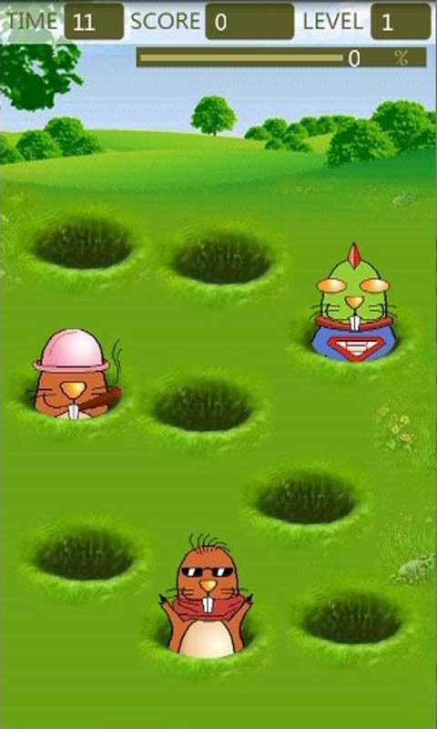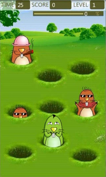 一款经典的打地鼠游戏 嚣张的地鼠无处不在,这一次出现在草坪上,他们躲在草洞里,对您的反应速度充满挑战,下手要快,不然他们又躲回洞里了,让我们一起教训他们吧!玩法:K冒出来的地鼠,但不能K绿色的地鼠,否则会扣分。