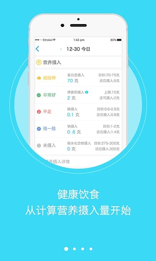 一.健康饮食,从计算营养摄入量开始患者可每天将自己每餐吃的食物记录下来,系统会自动显示您当餐摄入的营养元素情况,并根据您的干体重值,推算出您的主要营养元素每天应摄入量值是多少,同时对摄入量进行评价,更直观的告诉您当前摄入情况。