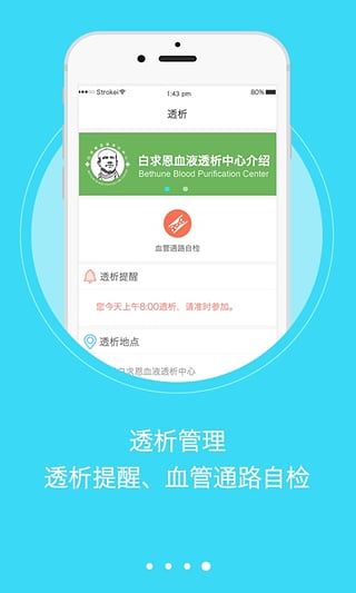 对于透析患者而言,透析前的血压决定了其是否适合透析,患者可每日早、晚记录血压,根据每日记录血压,显示血压评价,并可以看到历史血压记录,方便用户长期控制记录血压,进行血压管理