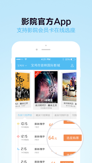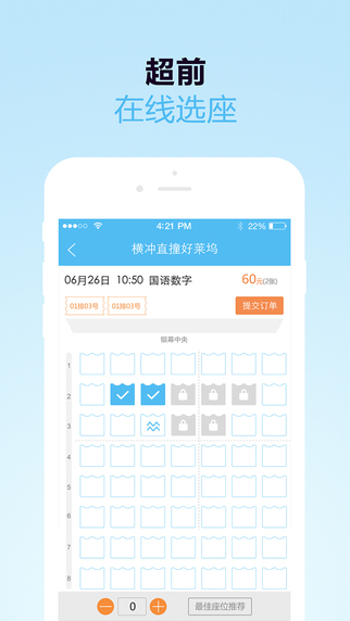1.实时在线选座,更便捷购票。2.减少购票流程,省流量更贴心。