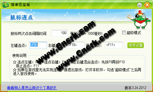 简单百宝箱鼠标连点 V5.1 绿色免费版 百宝箱鼠标连点器所有游戏通用,经过测试最快速度每秒点1000次!哈哈!不管你是要奇迹连点器,龙族连点器还是千年连点器,该工具都可以帮您达成所愿,不用再费劲心思的查找啦!简单百宝箱鼠标连点器统统满足你,而且该工具永久免费,绿色免安装.绝对的懒人必备工具!