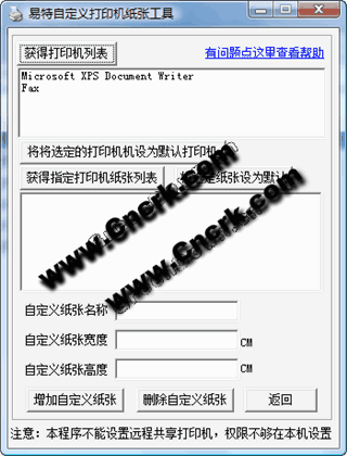 运行点击获取打印机列表,会显示本机所有的打印机选中某台打印机可以设置为默认等,这些都不是主要的 重要的是自定义各种尺寸的纸张,因为很多打印机不支持自定义纸张大小,特别是早期的针式打印机!本工具是解决这个问题!