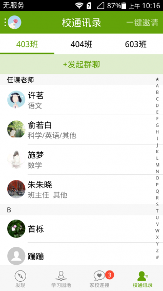[班级通讯录]方便与老师沟通孩子的教育问题。