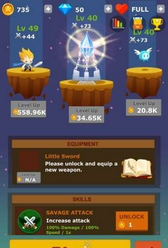 《点击英雄之战争的声音Tap Hero: War of Clicker》是一款动作类游戏,魔鬼被密封在世界各地的晶体里面,和怪物永远不会停止的斗争,怪物们为了释放自己的主人!作为一个英雄,只有你可以打到怪物,水晶印章只有一个!点击并按住以杀死所有怪物。点击使用技能战斗。点击升级你的英雄和你的宝宝。点击解锁传奇武器。通过敲击了所有的威胁保护水晶!游戏中玩家要控制主人公,通过点击与怪物战斗。还设置了升级养成的要素,玩家可以根据资源来分配升级。