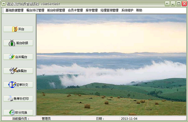 开台管理,前台收银管理,合并餐台,换餐台,签单补交,欠款补交,已结帐单置未结帐,帐单补打印,积分兑换。会员卡支持磁卡,条形卡,ID卡,IC卡,包括如下功能:会员类型设置,办理新卡,会员充值,会员卡挂失,挂失取消,挂失补办,卡密码修改,退卡管理,发卡查询,充值查询,会员余额查询,挂失查询,补卡查询,退卡查询,会员生日查询,会员消费查询。