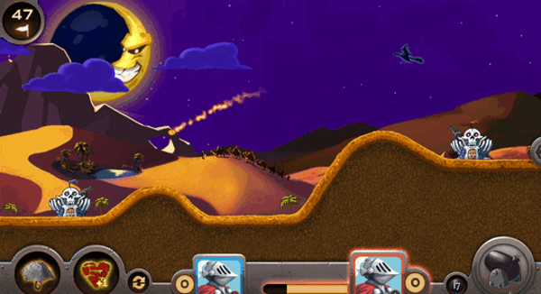 《火炮战争 Artillery》是一款在线单挑的休闲游戏,没有道具,也不能移动,你所需要做的只有根据风向调整发射方向和力度即可发射炮弹攻击对方的城堡,击中对方城堡三次即可获胜。亮点就在于在线单挑和模式简单了,游戏画面精美,设计简单,比较容易上手,值得试下!
