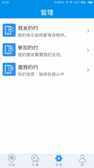 管理,提供我发的约、参加的约、邀我的约管理功能,对于我发的约,可以查看报名列表,拨打电话;