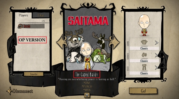 饥荒一拳超人MOD是饥荒游戏中的一款功能非常强大的mod文件,通过使用这款补丁,玩家将会在游戏中得到一个以一拳超人琦玉老师为原型制作的饥荒人物,并直接控制人物体验游戏别样的游戏趣味。