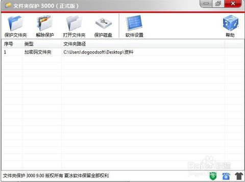 在我的电脑中需要加密码的文件夹上单击鼠标右键,选择文件夹隐藏,无论多大的文件夹就瞬间消失,你需要在文件夹保护 3000的主窗口通过保护记录才能打开或解除保护。