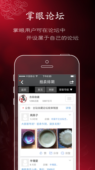 掌眼资讯:随时关注国内外古玩收藏相关资讯。古玩交流:开设了不同的收藏分类,根据藏友兴趣方向定向交流,设置了专业的权限规则,圈子外或国宝帮打扰不到专业藏友。