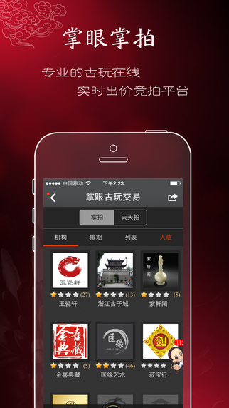 掌眼-古玩古董艺术品收藏交易平台是国内首个集手机古玩交易、手机古玩拍卖、手机古玩论坛、手机古玩店铺等功能为一体的古玩平台,其定位于用手机玩转古玩,是国内手机古玩行业的领军品牌,是中国最大的古玩艺术品收藏投资交流交易的手机古玩平台。【软件特点】