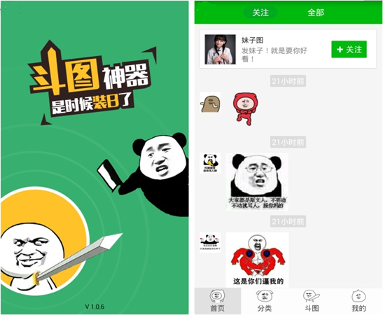 打开斗图神器,可以看到斗图,新图,制图,分类,我的这五个按钮,斗图区就像一个贴吧,不过这里拼的是图,新图区就可以看到最新的表情图了,让你走在微信群里的前沿,全是最新的图,制图是帮助大家自己作图的栏目,有模板可以使用。
