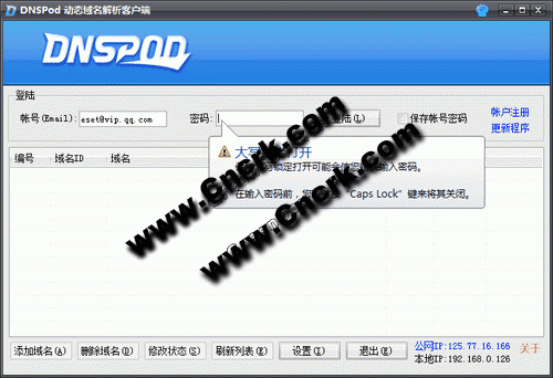 支持域名的添加/删除/修改/及状态和记录的添加/删除/修改/及状态。 支持记录类型/线路等的相关设置。提供了开机自动登陆的相关设置 支持定时更新指定域名的A记录解析到本地IP(目前只能是A记录)。