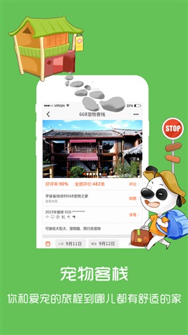 1、宠物客栈,共享旅游时光668宠物平台为宠友提供宠物客栈,您带宠物旅行时,可在平台预订喜欢的客栈带宠物一起入住,每家客栈均经过严格审核,再也不用担心入住被拒绝!