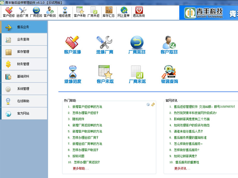 青丰售后返修管理软件是青丰科技官方推出的售后服务管理软件。该软件拥有返修、送修以及财务管理和厂商管理等基本的功能,还可支持条码枪哦,使用非常方便,无需培训即可轻松上手。