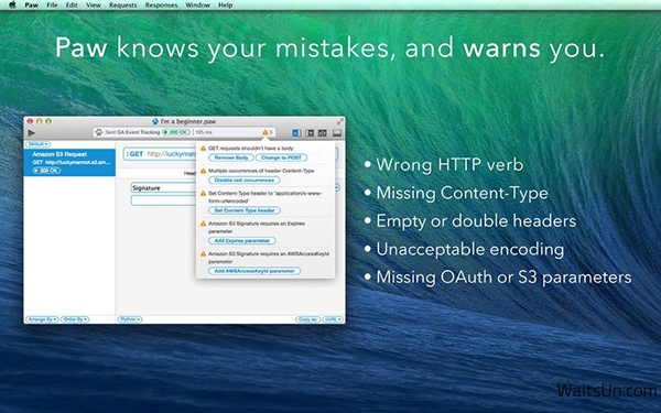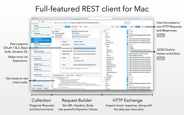 Paw HTTP Client是一款Mac上的HTTP客户端模拟测试工具,可以让Web开发者设置各种请求Header和参数,模拟发送HTTP请求,测试响应数据,支持OAuth, HTTP Basic Auth, Cookies等,这对于开发Web服务的应用很有帮助,非常实用的一款Web开发辅助工具。