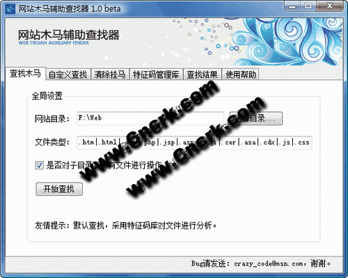 方便查找服务器上的网站木马,根据大家的需求和网站木马的多变性,特征码没有采用硬编码,可以在Rules.config里自行添加。