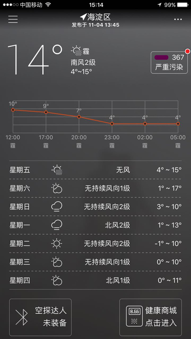 3.新增历史AQI的曲线记录,周期内污染情况一目了然;