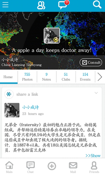 ----以你自己的兴趣爱好或所在行业为主题建立俱乐部,聚集跟你拥有相同话题的朋友,像异国、银发、时尚、飞行、游艇、设计、极限运动等等等等----谁都也可以发起线上/线下的活动,增进彼此之间的交际/留念。