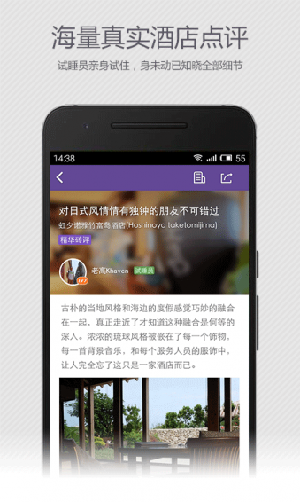 【】由全球最大的中文旅行平台去哪儿网全新出品,通过每日特色酒店推荐,每周精彩专辑分享,帮你“遇见你的酒店”,成为你最棒的酒店预定帮手。【真实入住体验】