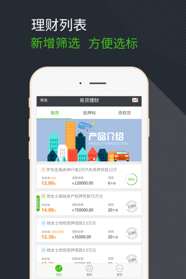 易贷理财是一款专业的手机金融理财服务应用软件,这款软件立足于p2p互联网模式,可以为用户提供一个高收益、低门槛、块周转、强保障的新型投资理财服务,感受不一样的投资体验。