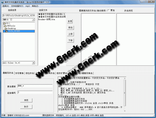 春林文件批量改名系统是一款功能强大集中了常用批量更名文件的优点的文件更名工具,可以把所有的文件快速方便的重命名;支持所有序号格式;支持更改文件扩展名,支持指定文件名的基本名称和扩展名,支持改名预览;支持按照mp3标签批量重命名文件,能去掉文件名中的数字、字母或其他指定字符,支持象acdsee那样按照指定模式重命名文件如自动添加序号,保留原文件名等功能; 可以直接根据文本中的文件名创建文件夹。
