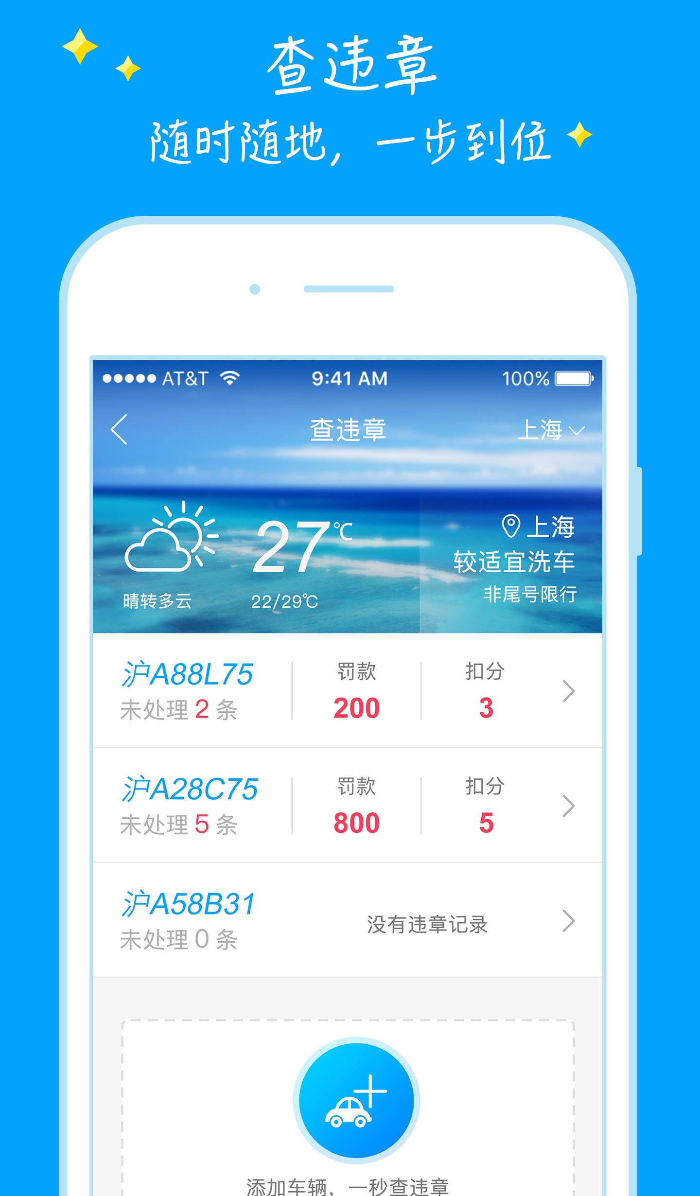 【便捷】直接输入车辆信息可随时查询违章信息;支持新浪、微信、QQ多种方式登录;【实时】违章后,会第一时间告知您爱车的违章信息、扣分和罚款;
