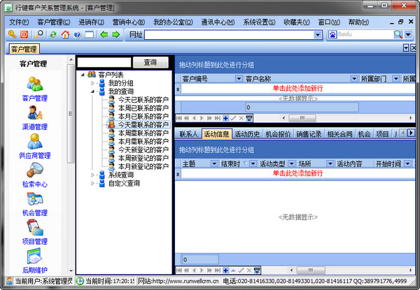行健客户管理系统是款面对中小企业的应用而精心设计的客户关系管理系统,界面美观,简洁易用,贯穿管理概念,令你思路清晰。【软件特点】