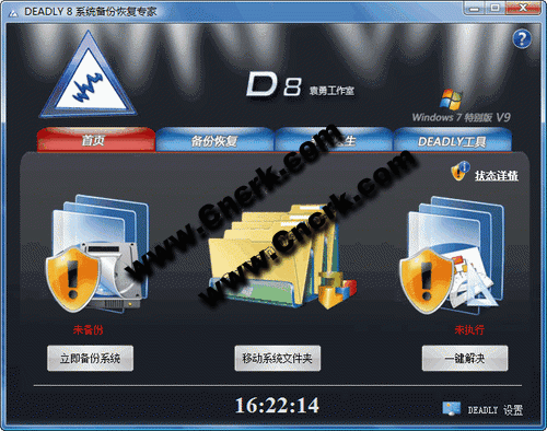 (D8)系统备份恢复专家 V10.03.0.926 Beta 简体中文官方安装版 DEADLY8 (D8) 是 32 位 Windows 版本的系统备份恢复软件 一个允许你备份、恢复和优化系统的强大工具。支持当今最为流行的Microsoft操作系统环境:Windows XP、Windows Vista、Windows 7。
