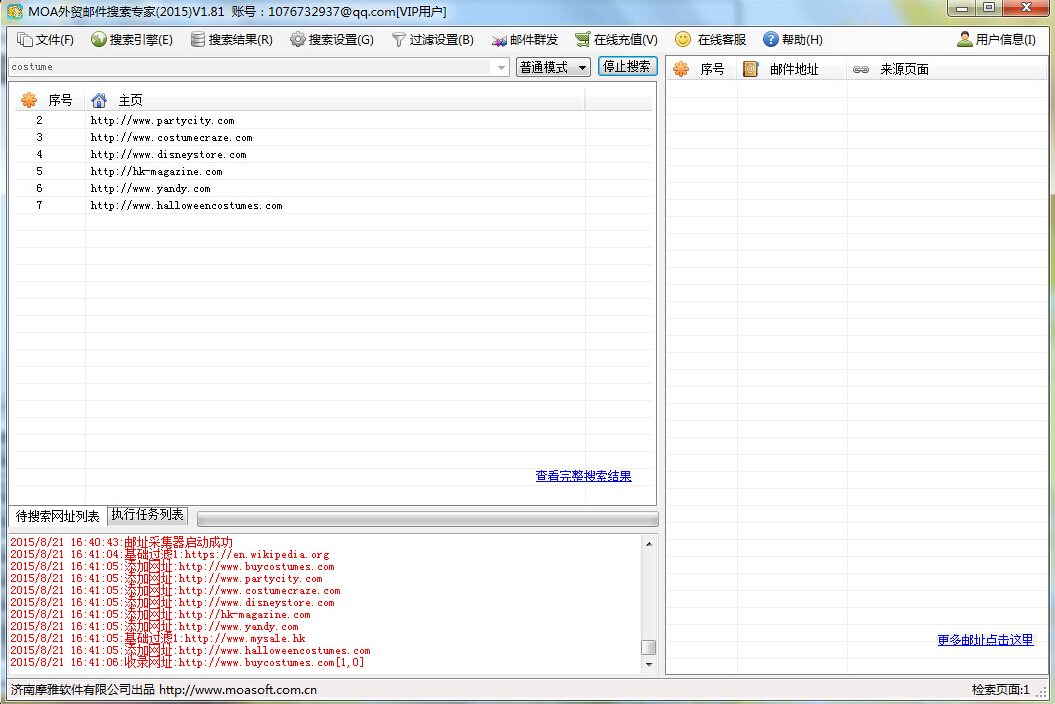 MOA外贸邮件搜索专家是一款外贸邮件搜索软件,用于开发外贸客户,使用搜索引擎来获取商家信息,18个全球搜索引擎、世界343个区域搜索引擎,200多个国家进行全方位,有针对性的进行地毯式搜索。
