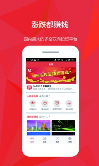 有别于同化顺,大智慧,东方财富,万得,招商,广发,中信等股票证券投资软件,在股宝你还可以进行双向交易,四维选股,期权两融策略免费用。上股宝,拥有最真实的模拟炒股场所,最全面的炒股策略,最便捷的在线开户交易,和千万股民风雨同舟。