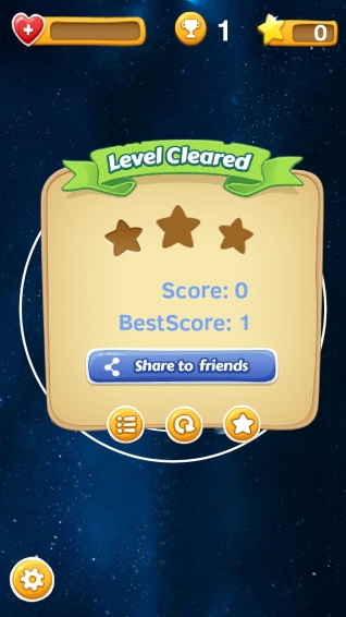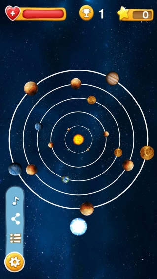 该游戏进行星空二维模拟,设置5条轨道,每条轨道上运行着不同的星球,点击屏幕实现星球跳跃,在此过程中应避免与其它星球发生碰撞,您有且仅有3次碰撞的机会,到达终点即积一分,积的分数越高,星球的旋转速度越快!