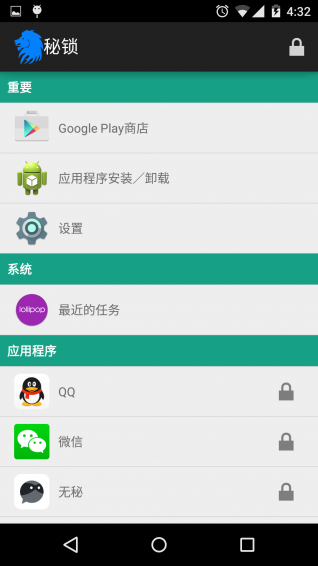 秘锁app是一款非常小巧的手机应用锁软件。该软件可有效的用密码锁来对手机内的应用进行管理,不用担心自己手机内的应用汇轻易泄露,就是如此的超强防御。