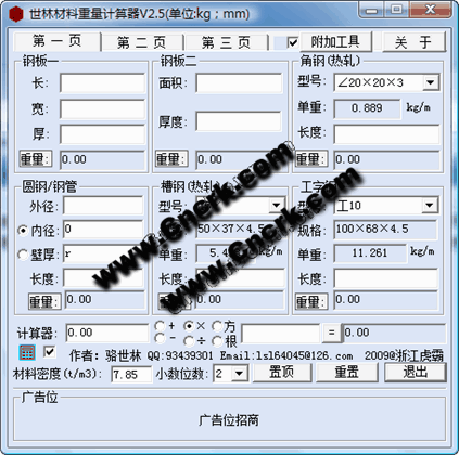 材料重量计算器 ,种类较齐全(钢板、角钢、工字钢、槽钢、H钢、T钢、钢管、方管、矩形管、圆钢、螺栓、螺母、垫圈、开口销、钢丝绳、焊管、花纹板、钢板网)外加一个计算器,可计算加、减、乘、除和乘方、开方。