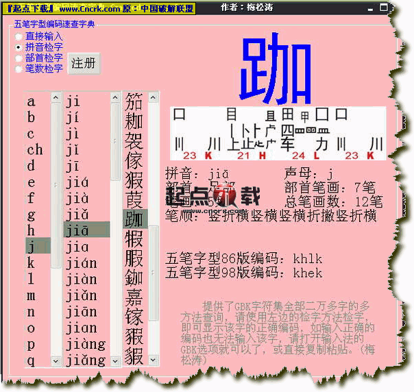 一、提供了GBK字符集全部二万多字的多方法查询,请使用左边的检字方法检字,即可显示该字的正确编码,如输入正确的编码也无法输入该字,请打开输入法的GBK选项就可以了,或直接复制粘贴。