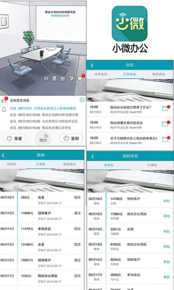 最新版小微办公,具有:移动考勤,报销管理,审批管理,会议管理,公告管理,文档中心,同事圈等功能。