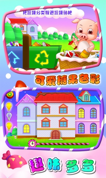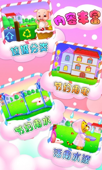 儿童教育系列是根据科学的宝宝早期教育方案而专为低龄儿童设计的早教益智产品,充分利用 宝宝的大脑发展黄金期让宝宝接受更多的新事物,让其大脑得到更全面的发育。 《儿童教育爱环保》 集合多种趣味小游戏,巧妙模拟生活场景,由可爱的角色带领宝宝进入游戏,引导宝宝了解相关环保知识,培养宝宝爱护自然的意识,教会宝宝垃圾分类,合理运用水资源懂得节约用水用电,从小开始培养环保小卫士,让宝宝健康成长!