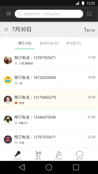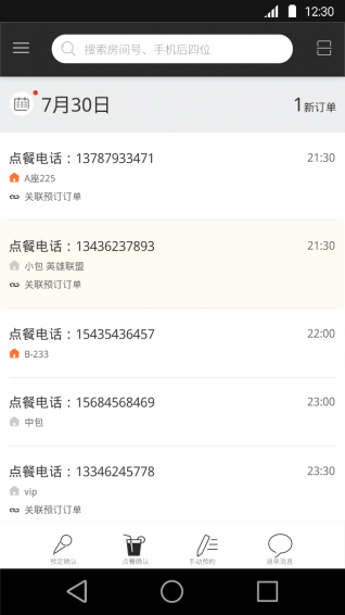 去嗨商家为KTV商户整合互联网入口,提供手机APP、网站、KTV微信公众账号接口等渠道,通过在线预订与支付功能帮助商户实现互联网入口的O2O(Online to Offline)转化。在线点单功能开启了用户点单与后厨管理的信息通道,帮助前厅缓解服务压力,改善商家运营效率,增强服务体验。预订管理: