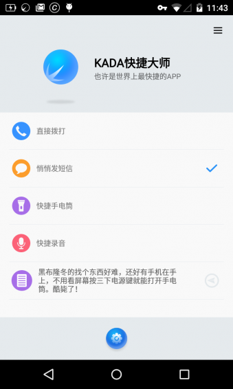 3、快捷手电筒:任何时候按三次电源键,快捷大师都会为您打开手电筒,还可以显示SOS的莫斯密码。