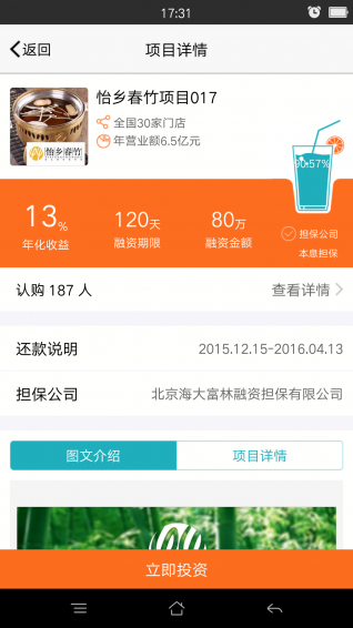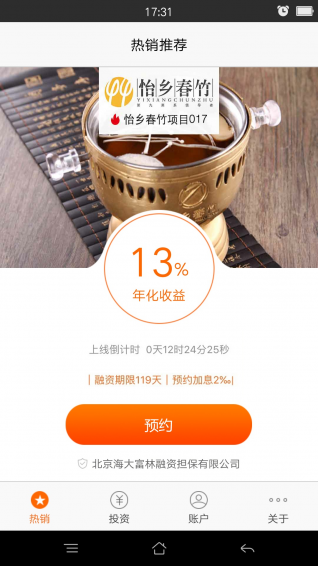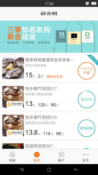 筷来财app是食金融开创者,中国领先的餐饮供应链投融资服务平台。筷来财app主要为用户提供高收益、有保障的安全理财产品。项目年化收益13%至15%,100元起投。筷来财由联创永宣、松树资本、九合创投等三家投资公司联合注资。主投资方联创永宣(833502)管理基金规模约30亿美元,福布斯2014中国最佳创业投资机构排名第7,已投资了160家公司,40家在境内外成功上市。