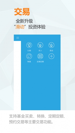2、交易:支持基金买卖、转换、定期定额、预约交易等主要交易功能。
