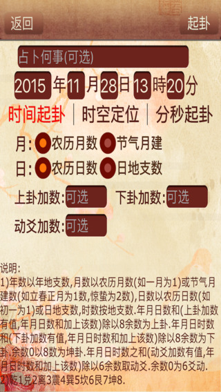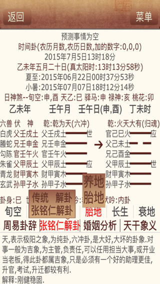 6.方便性,有周易卦辞;年月日时干支提示;各种时间神煞;并参考古今书籍提供用神,忌神,元神,仇神的旺相休囚,12状态,空破,刑冲合害,三合三会等等六爻常用判断信息的提示,提示之全此乃全网独一无二